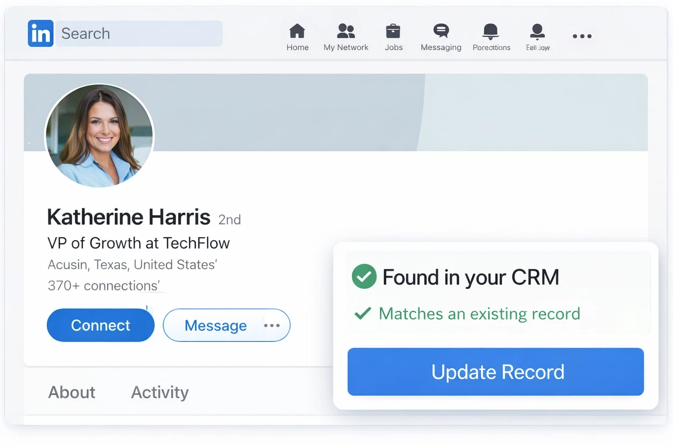 Work directly from LinkedIn while your CRM captures, structures, and updates every interaction in the background.