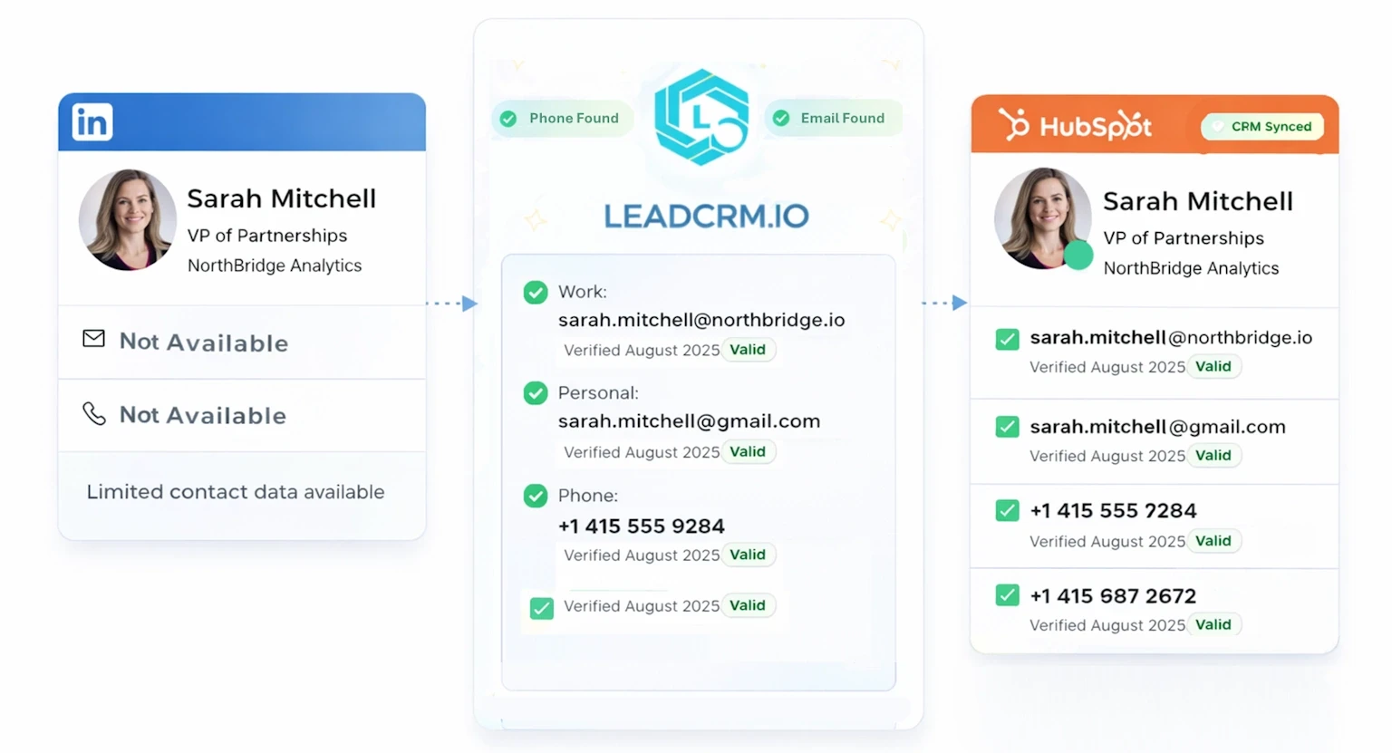 LeadCRM Data Enrichment fills missing details with verified contact information beyond what LinkedIn provides.